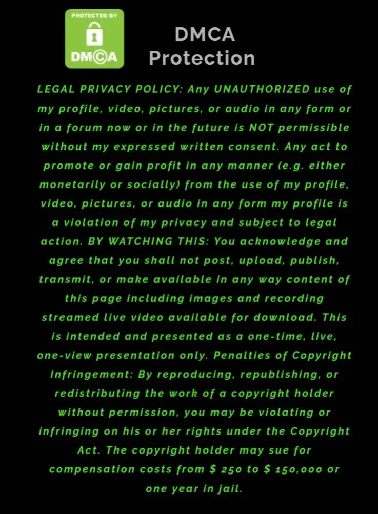 I do not give permission for anyone to record anything I do on this direct website without my consent. Anyone who tampers with my accounts, this is a federal offence, class B felony and punishable by $250,000 and 20 YEARS IN PRISON.